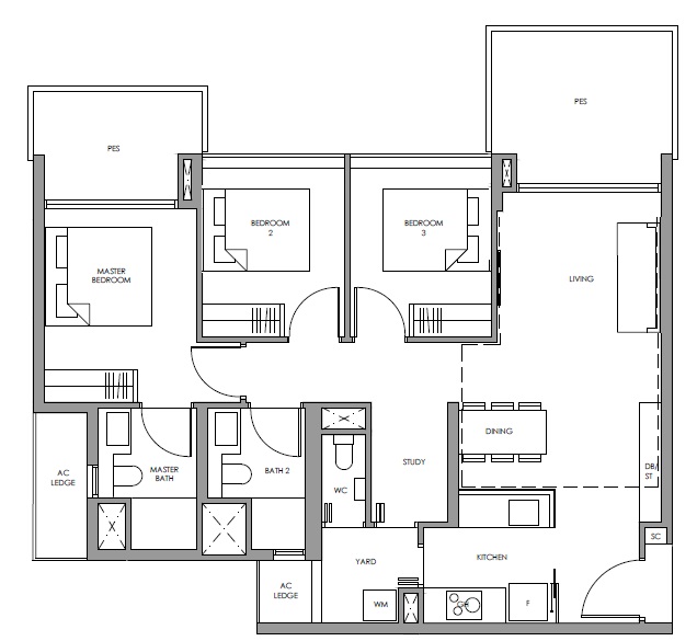| 3 Bed + Study | 1076 - 1130 | 68 |